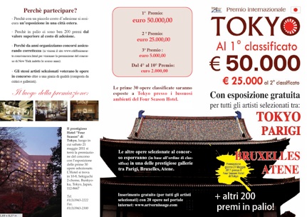 Ci complimentiamo per il suo notevole impegno creativo e Le ricordiamo che l’opera gia menzionata sara pubblicata nel numero de Febbrairo 2011 della rivista d’arte Boe e che concorrera all’assegnazione dei premi giorno 21 Maggi all ore 17,30 presso l’Hotel Four Season di Tokyo.