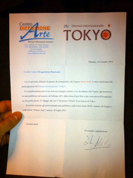con la abbiamo il piacere di comunicarLe che L’opera, Senza Titolo, e stata selezionata alla partecipazione del Premio Internazionale “Tokyo”